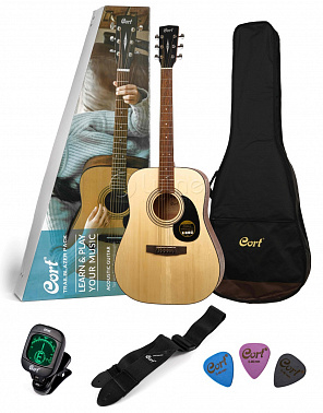 CAP810 Trailblazer - это стартовый набор "всё включено" с акустической гитарой, который позволит вам начать играть. Он включает в себя полноразмерную акустическую гитару формы дредноут AD810, чехол, удобный ремень, медиаторы и электронный тюнер, чтобы вы сходу смогли начать играть. Если вы ищете отличный подарок для начинающего музыканта или доступный способ начать играть самостоятельно, набор Cort CAP801 Trailblazer создан для вас.