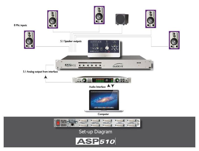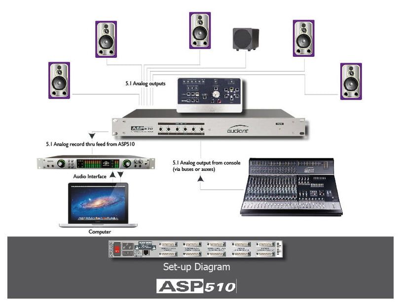 Audient ASP510 поддерживает для мониторинга три источника объемного звучания 5.1 и три стереоисточника. Предоставляя несколько surround- и стереовходов, а также выделенные инсерты Encoder/Decoder и консольный интерфейс, можно легко настроить ASP510 в соответствии с вашими требованиями. Эргономичные элементы управления позволяют вам эффективно настроить систему для работы над фильмом, процессом создания звуковых эффектов или простым микшированием в 5.1. ASP510 – это идеальное мониторное решение для систем окружающего звука в вашей студии.