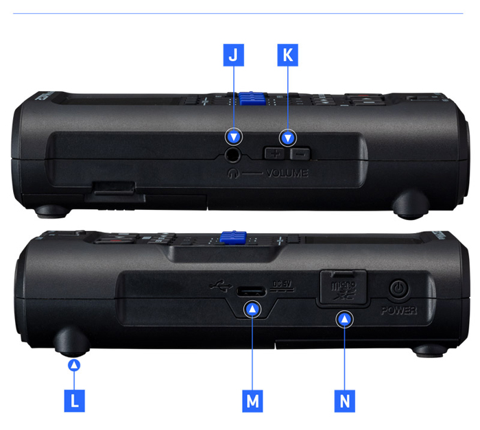 J: Выход для наушников - 3,5-миллиметровый выход для мониторинга ваших записей.