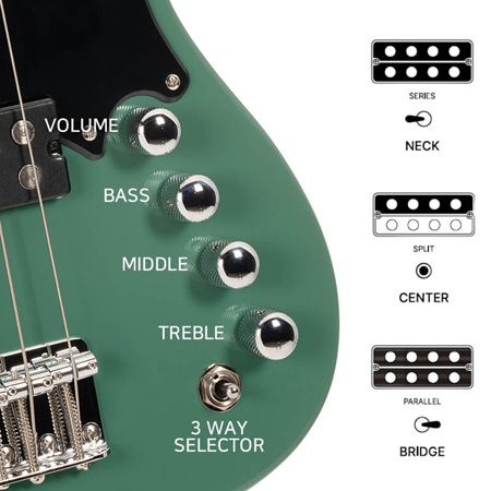 Компоновка элементов управления включает в себя основную громкость, 3-полосный эквалайзер для точного формирования тона и 3-позиционный селектор, который переключает звукосниматель между последовательным, раздельным и параллельным режимами, что позволяет музыкантам легко выбирать широкий диапазон тонов.