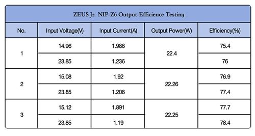 Инженеры Nux протестировали выходную эффективность ZEUS Jr. при разных входных напряжениях. Средняя выходная эффективность составляет 76,7% при входном напряжении 15 В и 77,3% при входном напряжении 24 В.