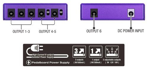 • 500 мА на выход 9 В постоянного тока питает практически любую педаль (за исключением одного, который обеспечивает 300 мА).