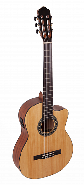 Классическая гитара с подключением всегда сразу намекает на свое предназначение в качестве сценического инструмента. При этом LA MANCHA Granito 32 CE-N звучит достойно и акустически: верхняя дека выполнена из ели, задняя дека, обечайка и гриф – красное дерево, а накладка и бридж – овангкол. На гитаре установлена система из звукоснимателя и темроблока с двухполосным эквалайзером и тюнером, а также имеется удобный вырез для доступа к верхним позициям ладов и стильное матовое покрытие. Смотрите на нашем канале обзор электроакустики с нейлоновыми струнами LA MANCHA Granito 32 CE-N!