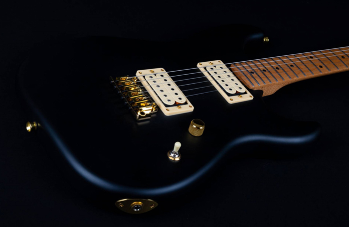 Серия 700 – корпус выполнен из липы. Гриф и накладка на гриф выполнены из печеного клена (roasted maple). Конфигурация звукоснимателей HH, бридж Wilkinson, фурнитура – золото, черный матовый цвет.
