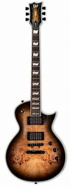 Из приятных особенностей можно отметить инкрустацию в форме флагов, полную окантовку по корпусу, грифу и головке грифа и высококачественную фурнитуру - локовые колки LTD и локовый бридж TonePros Tune-O-Matic. Цвет - Black Natural Burst.