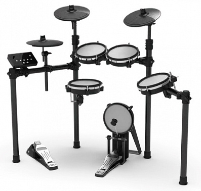В комплекте: 8” сетчатый малый барабан, 8” сетчатые томы (3 шт.), 8” пэд бас-барабана, три 10-дюймовые тарелки (ride, hi-hat, crash), педаль-триггер хай-хета, педаль для бас-барабана, алюминиевая рама, соединительные кабели, ключ для сборки и блок питания