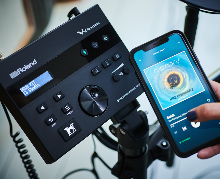 TD-07DMK предусматривает возможность игры под аккомпанемент любимых команд. Достаточно просто подобрать соответствующий материал на смартфоне, в планшете или компьютере, а затем передать потоковый аудиосигнал в звуковой модуль TD-07. Передается не только звук, но и видео, так что можно воспроизводить видеоклипы и видеоуроки. Кроме того, поддерживается передача MIDI-информации по Bluetooth для беспроводной записи MIDI-данных в музыкальные программные приложения. Если же подходящего устройства Bluetooth под рукой не оказалось, можно завести стереозвук и по кабелю.