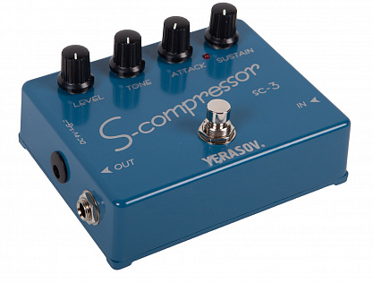 S-сompressor SС-3 предназначен для обогащения звучания электромузыкальных инструментов. Позволяет регулировать атаку звука, а также удерживает уровень выходного сигнала в заданных пределах, пропорционально ослабляя сигналы с большими уровнями, и усиливая слабые, что удлиняет звучание инструмента, сохраняя его натуральность, и предотвращает появление искажений. Гитарный эффект выполнен в литом силуминовом корпусе голубого цвета. На нем расположены четыре ручки управления, кнопка включения эффекта и светодиодная индикация включения. По бокам корпуса расположены входное и выходное гнезда и гнездо для подключения внешнего источника питания. Прибор имеет «холодный» by-pass. Достоинства этой педали – низкий уровень шума и возможность применения с гитарами, имеющими звукосниматели с большим выходным уровнем. Эта педаль подойдет как гитаристам, так и бас-гитаристам. Может применяться в студийных условиях, для концертной деятельности и на репетициях.