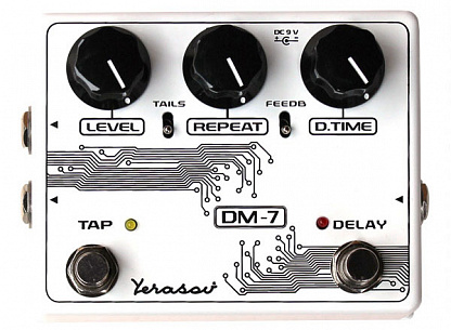Гитарный дилей-эффект Yerasov DM-7 представляет собой педаль стандартного удобного размера. На лицевой панели расположены регуляторы Level (уровень), Repeat (частота повторений), D. Time (время дилея), копки включения и Tap Tempo, а также переключатели Tails для настройки хвоста дилея и Feedback, который позволит создавать эмбиентные звуки. Питается педаль от стандартного блока на 9 вольт, имеет один вход и два выхода для работы с dry/wet сигналом. Если вы ещё не играли с такой педалью или у вас никак не получается желаемое звучание для любимого соло и читаемый перегруз, то смотрите наше видео о том, как настроить гитарный дилей на примере эффекта Yerasov DM-7!