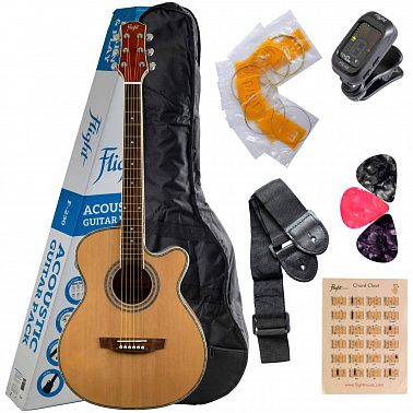 FLIGHT F-230 NAT PACK – это комплект с акустической гитарой натурального цвета и набором необходимых аксессуаров.