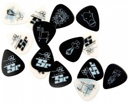 Медиаторы серии JS Design изготавливаются из высококачественного целлулоида и доступны в двух вариантах: белые с черной печатью и черные с серебряной печатью. В каждой упаковке 10 медиаторов с оригинальными рисунками Джо Сатриани (Joe Satriani).