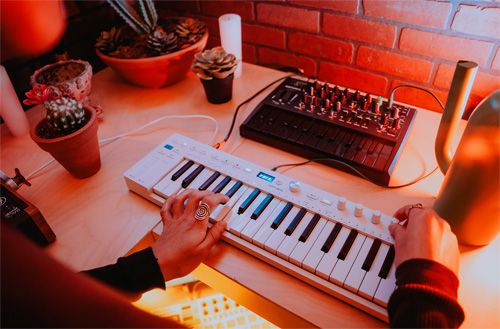 37-клавишная клавиатура с тонкими клавишами, чувствительностью к скорости нажатия и функцией aftertouch обеспечивает исключительную выразительность при компактных размерах. Сенсорные полосы pitch и modulation позволяют интуитивно управлять звучанием в реальном времени, а режимы аккордов и гамм помогают быстро находить новые музыкальные фразы.