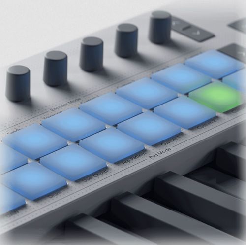 Пэды: 16 чувствительных к скорости нажатия пэдов с RGB-подсветкой и полифоническим послекасанием, 2 кнопки выбора пэдов