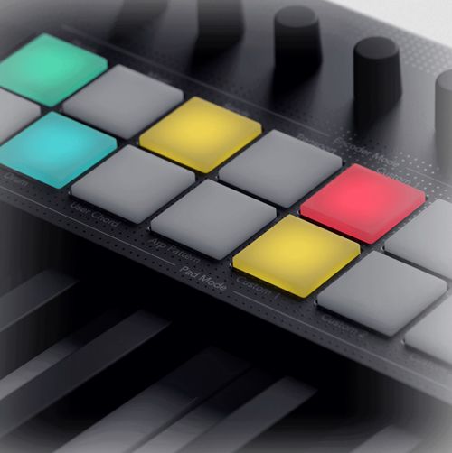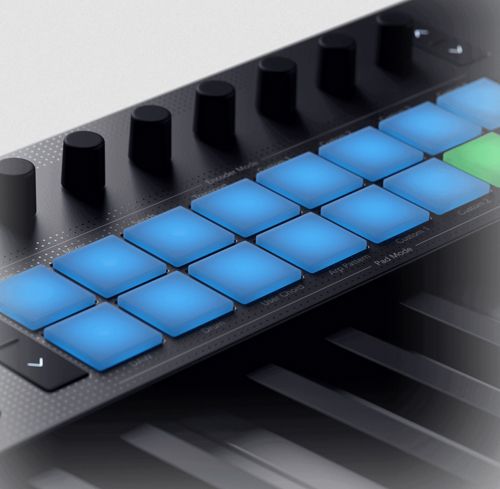 Launchkey Mini 25 оснащен запатентованными чувствительными к силе нажатия пэдами FSR с полифоническим послекасанием для предпочитающих драмминг. Каждый пэд использует уникальный радиальный датчик для большей чувствительности и стабильности, обеспечивая более четкое и выразительное исполнение. Их также можно настроить на воспроизведение аккордов или индивидуальных нот с полифоническим послекасанием.