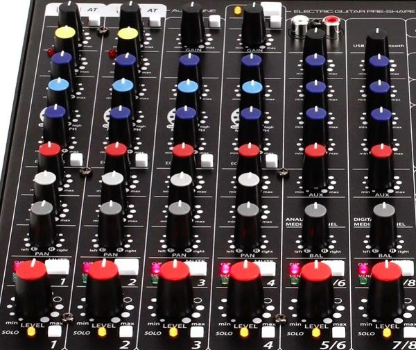 - Регулятор панорамирования (Pan) на 1-4 каналах и регулятор баланса (Bal) на 5/6 7/8 каналах канала;