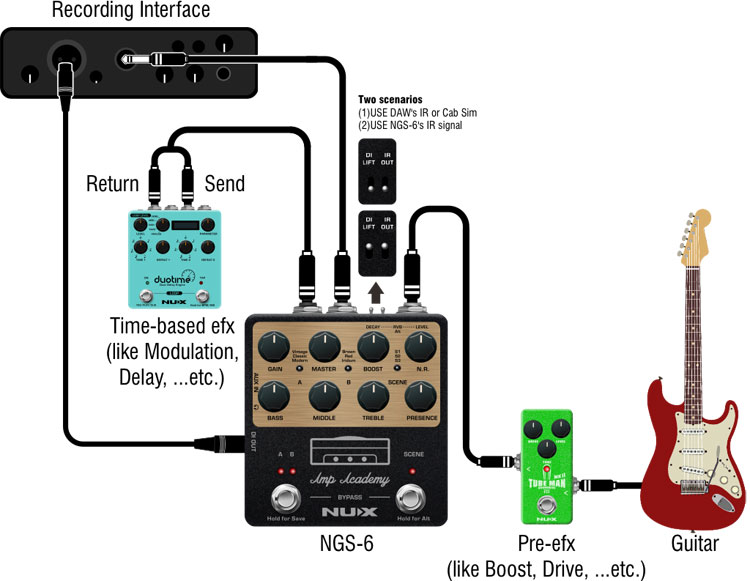 Подключите Amp Academy напрямую к интерфейсу для записи, чтобы мгновенно получить превосходный гитарный звук без необходимости настраивать усилитель или микрофоны. (Переведите переключатель IR OUT в положение UP, если вы хотите использовать IR-сигнал для 1/4" выхода. Если вы хотите включить/отключить ИК- IR с выхода DI OUT, УДЕРЖИВАЙТЕ ножной переключатель A/B и включите педаль. IR ON: Индикаторы A/B мигнут 3 раза. IR OFF: индикаторы A/B НЕ будут мигать.)