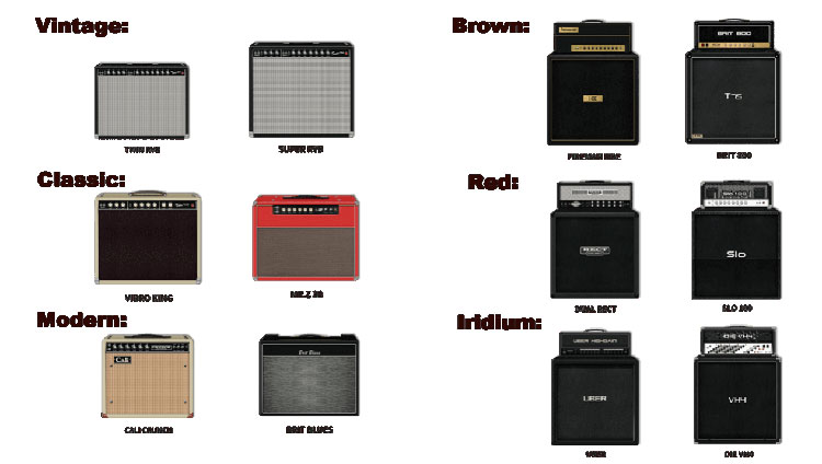 В Amp Academy представлены 6 легендарных моделей усилителей, таких как Vintage (Fender Twin Reverb), Classic (Fender Vibro King), Modern (Mesa Boogie Mark I), Brown (Friedman HBE), Red (Mesa Boogie Dual Rectifier) и Iridium (Bogner Uberschall). Знаменитый алгоритм моделирования усилителей TSAC-2K предлагает вам реалистичное звучание и быстрый отклик.