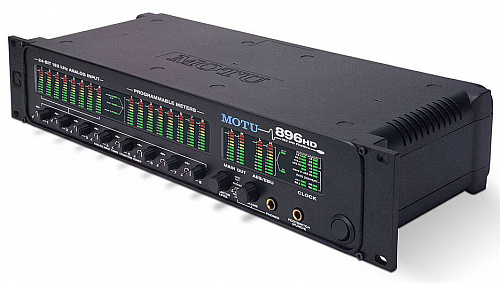Двухрэковый аудиоинтерфейс MOTU 896 HD предназначен для многоканальной записи на жесткий диск в студиях, осуществляющих сложные проекты на базе PC или Mac. Каждый из восьми аналоговых входов (комбинированные разъемы джек/XLR) имеет предусилитель, регулятор чувствительности, кнопку включения фантомного питания (48 В), переключатель входного уровня на задней панели (три варианта: микрофонный, линейный и +4/FIXED, в последнем случае отключается регулятор чувствительности). Регулятор уровня мониторных выходов переключается на управление уровнем выхода для наушников, плюс предусмотрен отдельный регулятор уровня входного мониторного сигнала. Использованы высококлассные ЦАП и АЦП. Есть вход для ADAT-синхронизации (девятиконтактный D-Sub), вход для педального переключателя (управление врезкой при записи), вход и выход Word Clock. Один из двух имеющихся разъемов FireWire предназначен для соединения с компьютером, другой - для подключения еще одного интерфейса MOTU: 896 или 828. До четырех интерфейсов может одновременно работать с одним компьютером без использования концентратора (два-три интерфейса при частотах 88,2 и 96 кГц). Устройство имеет встроенный блок питания. Прилагаются драйверы WDM (поддерживают Wave), GSIF и ASIO 2.0 для Windows Me/2000/XP, драйверы Core Audio/Sound Manager и ASIO 2.0 для MacOS 9, программа управления (Windows и MacOS), программа AudioDesk (MacOS), кабель FireWire длиной пяти метров.