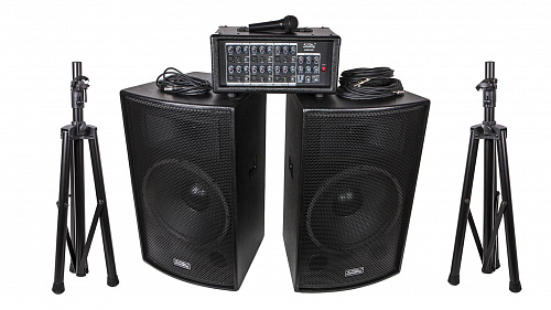 Мобильный звуковой комплект общей мощностью 500 Вт состоящий из микшерного пульта со встроенным усилителем и акустических систем с 15" динамикам и пьезо твитером. В комплект поставки так же входят две акустические стойки под АС, динамический микрофон с кабелем 5 метров и два акустических кабеля Jack-Jack длиной по 10 метров каждый.