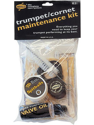 Набор по уходу за трубой/корнетом: гибкая щетка HE75, защита клапанов HE80, шарики splitballs HE186, щетка для клапанов HE83, полировочная салфетка HE96, щетка для мундштука HE84, смазка для слайдеров HE91, масло для клапанов HE448, инструкции по использованию