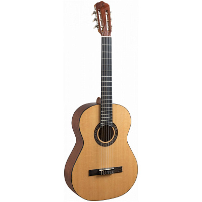 Верхняя дека изготовлена из ели, что обеспечивает чистое звучание, так необходимое для грамотного развития слуха. Нижняя дека и обечайки из сапеле, породы дерева по свойствам очень схожим с красным деревом, благодаря чему звук приобретает мягкость и глубину. Достаточно толстая, порядка 6 мм, палисандровая накладка на грифе создает в руке ощущение приятной весомости и надежности.