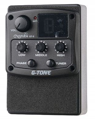 GT-2 представляет собой 3-полосный эквалайзер с хроматическим тюнером и Phase эффектом. Очень легко устанавливается на гитару, видимые размеры составляют всего 52 х 48 х 4 мм. Оснащен функцией автоматического определения уровня заряда батареи.