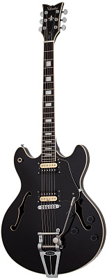 SCHECTER CORSAIR G. BLACK - это полуакустическая электрогитара, выполненная в полностью полом корпусе, предполагающим полное отсутствие звуковых блоков в пределах внутренней части корпуса. Гитара может похвастаться эффектным внешним видом за счет корпуса из клена и плотного, надежного грифа из трех кусков красного дерева с накладкой из черного дерева и 22 ладами размера Medium. За формирование звука отвечают фирменные звукосниматели Schecter Diamond '78, два регулятора громкости и тона с Push-Pull отсечкой и 3-х позиционный переключатель звукоснимателей. Утонченный дизайн Corsair позволит вам с максимальным удобством играть как на сцене, так и в студии, а изящная глянцевая черная отделка инструмента вкупе с хромированной аппаратной составляющей делают гитару красивой с эстетической точки зрения.