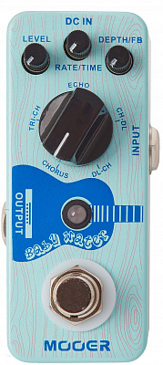 Mooer Baby Water разработана специально для музыкантов, играющих на акустической гитаре. Благодаря высококачественной платформе с цифровыми эффектами, вы сможете получить чистое звучание эффекта хорус или дилей, либо двух эффектов одновременно при помощи поворотного переключателя. Хорус представлен в двух вариантах - классическом и TRI-CHI triple, обладающим более глубоким звучанием. Режим ECHO предлагает теплое звучание эффекта задержки; CH-DL - богатое звучание с эффектом хоруса, обработанное дилеем; DL-CH добавляет звучание хоруса на основе эффекта задержки. Помимо этого, немаловажным преимуществом Baby Water является возможность получить эффект похожий на реверберацию, при помощи регуляторов Time и Feedback.