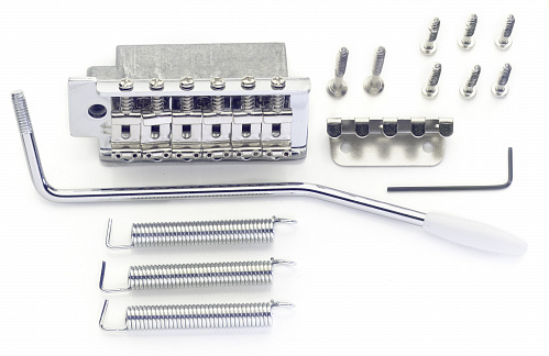 Бридж для электрогитары типа Stratocaster • Винтажного стиля седла • Фиксация на 6 винтов • Рычаг тремоло с белым наконечником • Цвет: хром