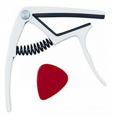 Каподастр на пружине для акустических гитар и электрогитар • Материал: цинковый сплав • Цвет: белый • В комплекте: медиатор