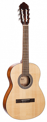 Классическая гитара АС200-3/4 имеет уменьшенный размер корпуса и укороченную мензуру, еловую верхнюю деку для резонансного тона, который со временем только улучшается, махагоновую заднюю деку и обечайки, махагоновый гриф, накладку и бридж из мербау, и струны Savarez Cristal Corum.