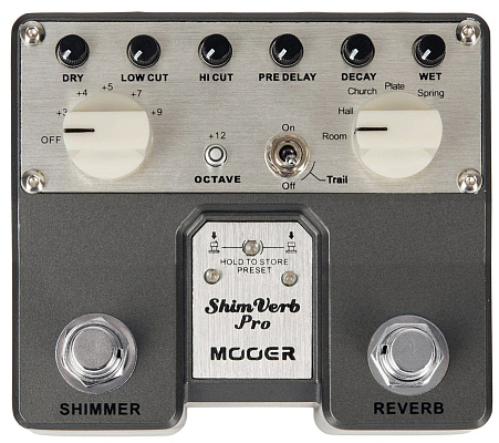 Shimverb Pro включает пять эффектов реверберации: Room, Hall, Church, Plate, Spring. Регулятор DECAY позволяет изменять объем и глубину эффекта. Регулятор Shimmer добавляет новую функцию - сочетание 5 переключателей и кнопка Octave, которая создает другой эффект и дает больше вариантов звучания для вашего инструмента. Кроме того, Shimverb Pro имеет регуляторы Dry/Wet, Hi Cut/Low Cut, стерео вход и стерео выход.
