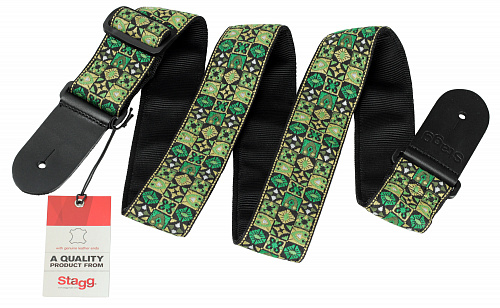 Гитарный ремень с рисунком Hootenanny Mix • Материал: нейлон • Кожаные наконечники с выгравированным логотипом • Регулируемая длина: 82-141 см • Ширина: 5 см • Цвет: зеленый