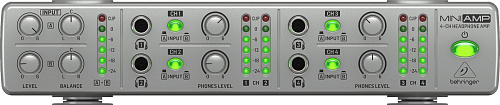 • 2 балансных Stereo Main входа с независимыми контроллерами Level и Balance для индивидуальных миксов, выбираемых для всех 4 усилителей наушников