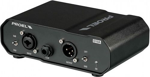 PROEL D10A представляет собой активный директ-бокс с трансформатором, для работы которого требуется фантомное питание. Преимуществом трансформатора является возможность избежать какого-либо электрического соединения между источником звука и микшером. Это дает два огромных плюса: при отсутствии электрического пути устраняются контуры заземления и возможно подавление синфазных шумов, таких как жужжание. Преимущество активного DI-BOX перед пассивным заключается в нулевых вносимых потерях и меньших шумах на выходе.