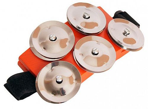 Деревянный тамбурин со 5-ю парами стальных джинглов и креплением ремешком на липучке на ногу.