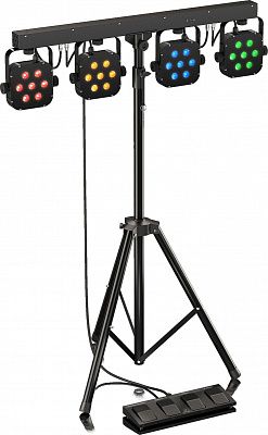 EUROLIGHT STAGE TRI LED BUNDLE ST1 — это полноценная система, готовая к использованию прямо из коробки. В комплект входят четыре плоских PAR-прибора, предварительно установленных на одной Т-образной штанге управления в чехле для переноски, прочный штатив длиной 2,4 м с сумкой для переноски и четырёхпедальный ножной переключатель в металлическом корпусе. Штанга управления оснащена встроенным 35-миллиметровым креплением для стойки, несколькими точками подвеса и двумя выходами питания на каждом конце (адаптер не требуется), что значительно упрощает компоновку и настройку.