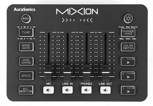 Модель AuraSonics MIXION представляет собой комбинированное устройство, сочетающее одновременно функции звукового USB-интерфейса и цифрового микшера. Его сновным назначением является работа со звуком в прямом эфире во время стримов или игр. Также устройство может быть с успехом использовано для записи подкастов, аудиокниг и т.д.