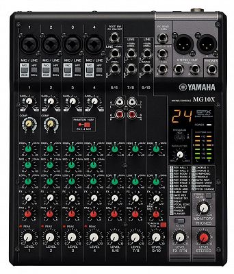 10-канальная микшерная консоль: макс. 4 микрофонных / 10 линейных входов (4 монофонических + 3 стереофонических) / 1 стереофоническая шина / 1 линейный вход (в т. ч. для спецэффектов)