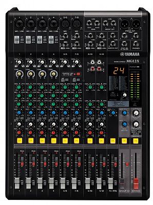 12-канальная микшерная консоль: макс. 6 микрофонных / 12 линейных входов (4 монофонических + 4 стереофонических) / 2 групповых шины + 1 стереофоническая шина / 2 линейных входа (в т. ч. для спецэффектов)