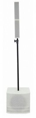 1 моно режим: Два сателлита спарены «верх к верху» (благодаря простой и быстрой системе «защелке») и установлены над сабвуфером при помощи D25 мм стойки.