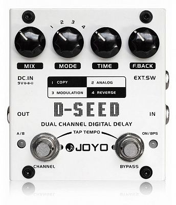Joyo D-SEED-Joyo – педаль цифровой дилей с двумя каналами, обладающая полным набором функций и позволяющая сохранить два пресета тона. Максимальное время задержки составляет 5,94 секунды. Возможна работа в четырех режимах, включая Copy, Analog, Modulation и Reverse. Также можно регулировать микс, время и F. Back. На панели находятся четыре регулятора, два футсвича и два индикатора состояния. Для подключения имеется входной и выходной моноканалы, а также вход Ext. Sw. Он используется для переключения пресетов другим устройством.