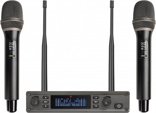 Axelvox DX800HT - высококачественная двухканальная беспроводная цифровая вокальная радиосистема профессионального уровня с DSP, состоящая из двух микрофонов и двухканального приемника. Станция способна анализировать эфир и автоматически находить оптимальные (свободные) частоты для работы. Расширенный частотный диапазон 650 - 758 МГц.