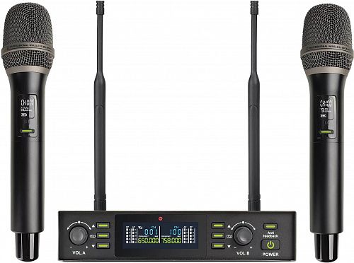 Axelvox DX800FK - высококачественная двухканальная беспроводная цифровая вокальная радиосистема профессионального уровня с DSP с функцией подавления обратной связи (Anti feedback), состоящая из двух микрофонов и двухканального приемника. Станция способна анализировать эфир и автоматически находить оптимальные (свободные) частоты для работы. Расширенный частотный диапазон 650 - 758 МГц.