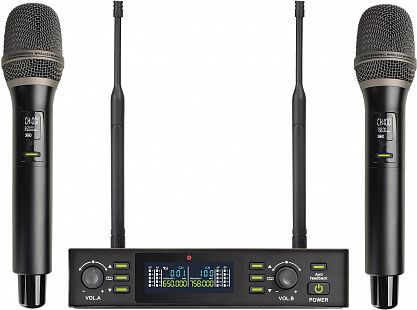 Тип: Двухканальная беспроводная цифровая вокальная радиосистема профессионального уровня с DSP, с функцией подавления обратной связи (Anti feedback), состоящая из двух ручных микрофонов и двухканального приемника