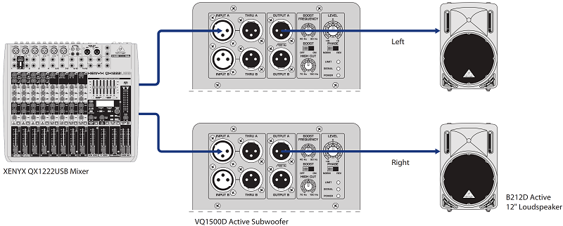 Сабвуфер BEHRINGER VQ1500D оснащен балансными входами и выходами с разъемами XLR, а так же сквозным посылом Thru для подключения дополнительной акустики. Регулятор Boost Frequency позволит выбрать нужную частоту между 45 и 90 Гц, чтобы усилить её на 10 дБ. Так же VQ1500D присутствует регулировка High Cut, дающая возможность задать верхний порог частот, воспроизводимых сабвуфером. Она никак не сказывается на акустических системах, подключенных посредством выхода Thru, однако, позволяет осуществить более точный баланс с колонками, скоммутированными через выход Output. Регулятор Level задает уровень входного усиления, а переключатель Phase включает воспроизведение сигнала, посылаемого на выход, в противофазе, что компенсирует разницу в частотах между сабвуфером и сателлитом. Светодиоды на задней панели отображают перегрузку, наличие входящего сигнала и включение питания.
