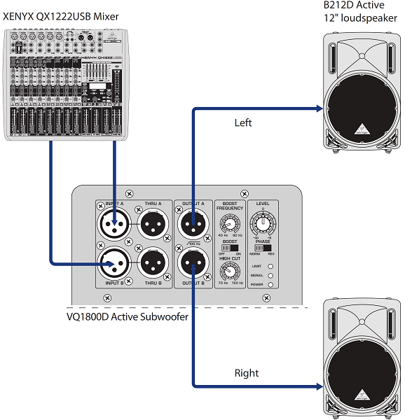 Сабвуфер BEHRINGER VQ1800D оснащен балансными входами и выходами с разъемами XLR, а так же сквозным посылом Thru для подключения дополнительной акустики. Регулятор Boost Frequency позволит выбрать нужную частоту между 45 и 90 Гц, чтобы усилить её на 10 дБ. Так же VQ1500D присутствует регулировка High Cut, дающая возможность задать верхний порог частот, воспроизводимых сабвуфером. Она никак не сказывается на акустических системах, подключенных посредством выхода Thru, однако, позволяет осуществить более точный баланс с колонками, скоммутированными через выход Output. Регулятор Level задает уровень входного усиления, а переключатель Phase включает воспроизведение сигнала, посылаемого на выход, в противофазе, что компенсирует разницу в частотах между сабвуфером и сателлитом. Светодиоды на задней панели отображают перегрузку, наличие входящего сигнала и включение питания.