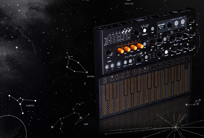 Откройте для себя синтезатор, выполненный в полностью черном корпусе, украшенный детальной графикой "space-age", отражающей все его элементы управления.