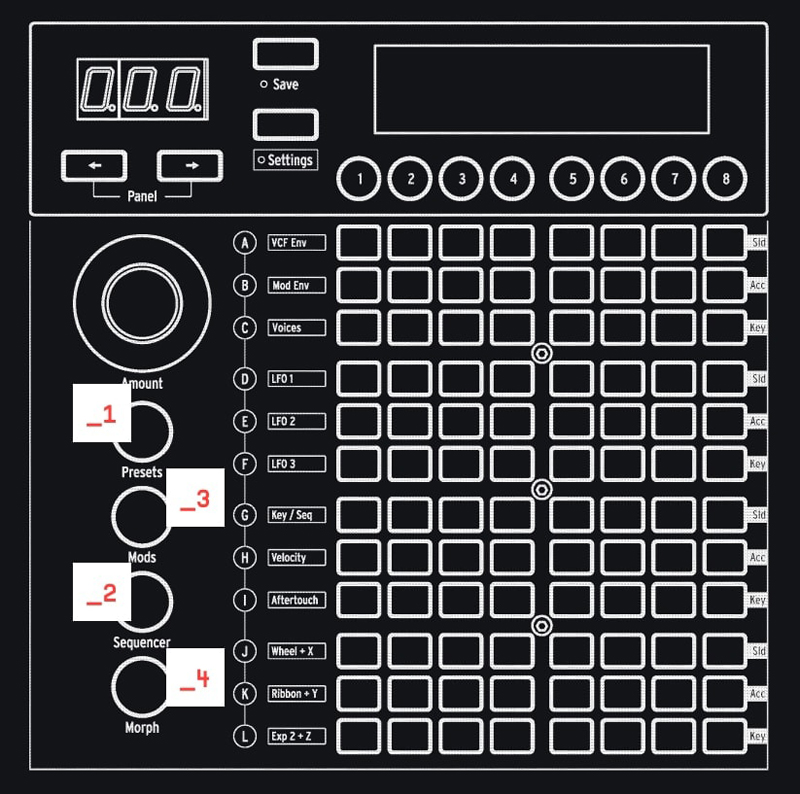4 Morph: Настраивайте источники и направления модуляции для статусов A и B в пресете, чтобы усилить контрастность и цвет морфинга.