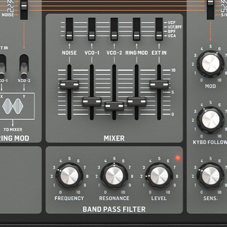 Если вам нравится настоящее создание звука, то MS-5 поможет вам. Микшер сигналов имеет пять ползунков для регулировки шума, VCO 1 и 2, кольцевой модуляции и даже внешних сигналов. А если вы хотите сделать свой звук еще более сложным, можно использовать дополнительный полосовой фильтр для регулировки частоты, резонанса и уровня на протяжении всей последовательности, чтобы добавить еще больше волшебства.